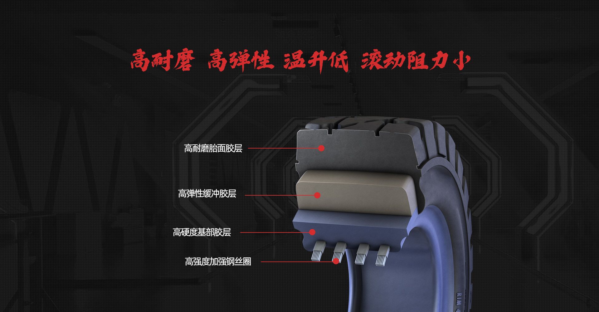 實心輪胎主要適用于地面復(fù)雜惡劣工況下的叉車、拖車、裝載機、軍用車輛等機械車輛的配備,廣泛應(yīng)用 于鋼鐵廠、礦山、建筑工程、港口、物流、廢金屬加工廠等領(lǐng)域。 實心輪胎胎體為全橡膠構(gòu)成,最大限度地保證了輪胎的耐刺穿性,從根本上消除了工業(yè)車輛在承載運行過 程中及在惡劣的作業(yè)環(huán)境中的輪胎刺穿隱患。實心輪胎的負(fù)荷—形變量小、運行穩(wěn)定性好,因其耐刺耐撕、耐 高溫、耐腐蝕、耐磨損,無需充氣,避免了頻繁補胎換胎的繁重勞動,可提高車輛的使用率和工作效率,在低 速、高效運行車輛